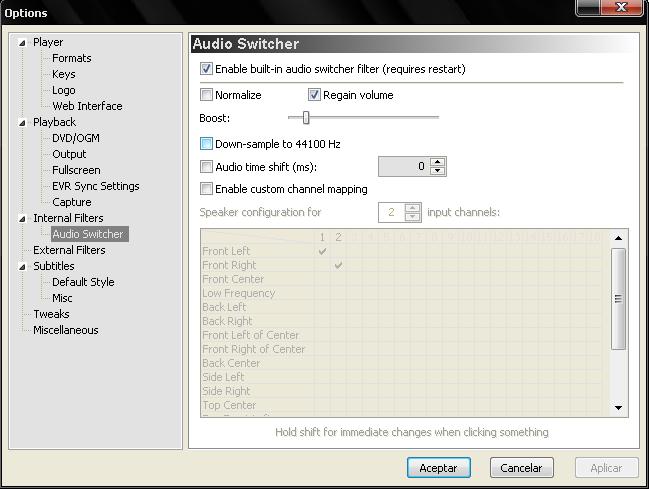 Y esta opción es para los vídeos con doble audio, la que importa es la primera, y tiene que estar marcada para reproducir un solo audio a la vez. (Mientras vean el vídeo pueden cambiar de pista con la letra "A" pero eso también se puede asignar a otra tecla.)